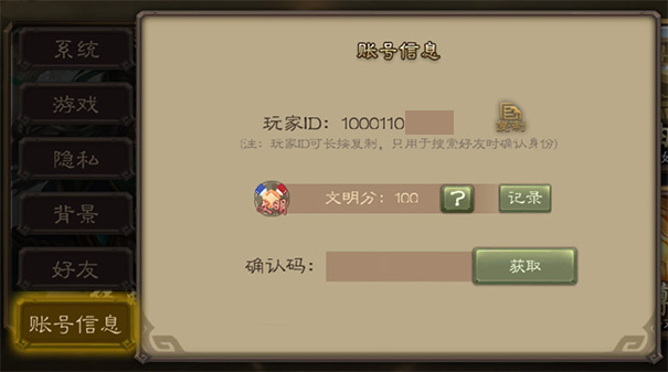 玩家ID及确认码,可前往"游戏大厅-菜单栏-设置-账号信息"中查看